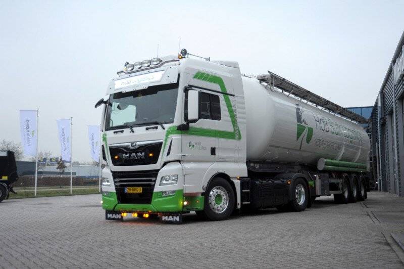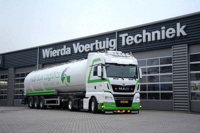 De trucks van HdB Logistics hebben een vaste chauffeur en er wordt gewerkt met vaste opleggers. ‘Het materieel is belangrijk voor ons en door de chauffeur een vaste combinatie te geven blijft alles in topconditie’, aldus Tjerk Hamstra van HdB Logistics. De MAN TGX is uitgerust met de bewezen zuinige D26 krachtbron met 470 pk in combinatie met de MAN TipMatic 12+2 versnellingsbak. De trekker is voorzien van een PTO aangedreven RTI compressor en een hydrauliek set voor de toepassing met walking-floor en bulkopleggers. Verder is de MAN voorzien van een stoere zonneklep met ingebouwde lichtbak, extra verlichting, aluminium wielen en een zwart gespoten ondergrille. Ook de brandstoftank en de behuizing van de compressor zijn hoogglans zwart gespoten. Het resultaat is een bijzonder strak ogende trekker en een rijdend visitekaartje voor HdB Logistics.